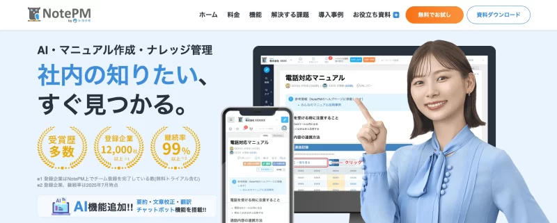 NotePMは、登録企業12,000社以上、継続率99%を誇る、ナレッジ管理に特化した社内ポータルサービスです。